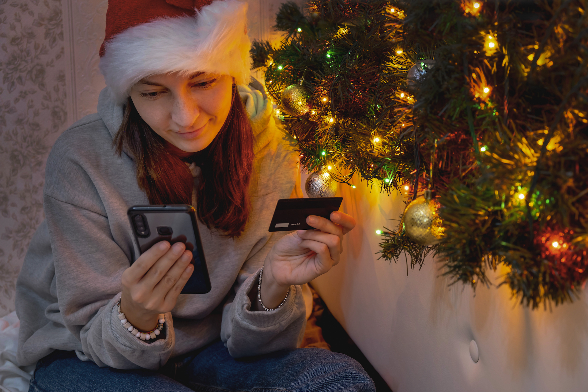 Home > Seasonal Scams to Avoid Through the Holidays > Millennial,Woman,Makes,Online,Christmas,Shopping,,Holding,A,Mobile,Phone